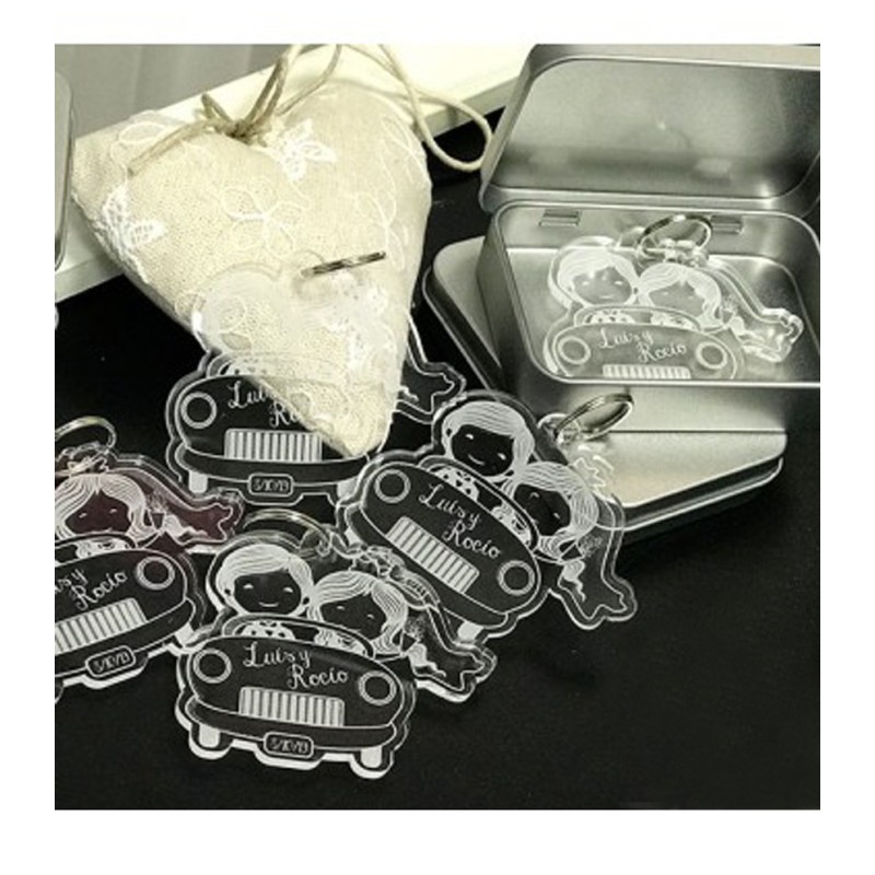 Llaveros de metacrilato para boda de los novios en coche, totalmente personalizados.
