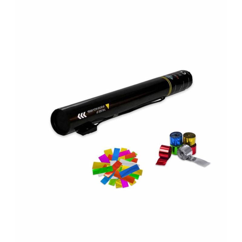 Cañón de confeti eléctrico de 50 cm. de largo, con confeti rectangular brillo + serpentinas brillo de 0,85 cm. de ancho x 5 metros de largo.