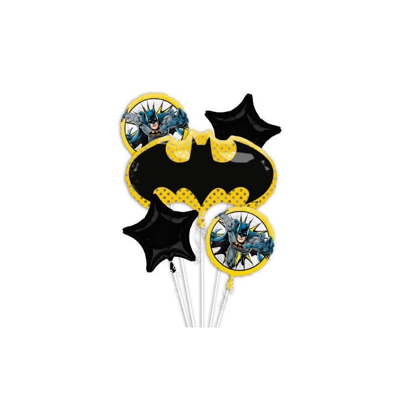 Bouquet compuesto de 5 globos foil metálicos DECO de 45 centímetros/18 pulgadas de diámetro de Batman del licenciatario Anagram® que requiere 0,106m3 de helio. Es perfecto tanto para decorar como para regalo. Crea un ambiente de película ¡Hará las delicias de los pequeños al ver a sus personajes favoritos!