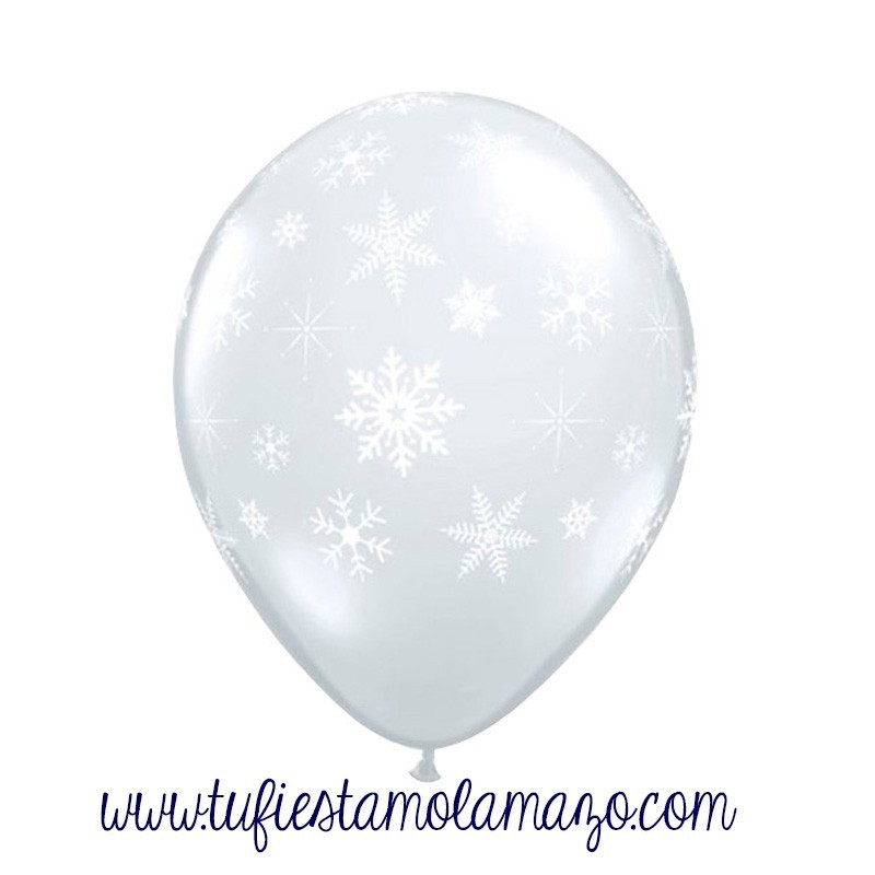 Compra globos navideños con un divertido diseño de navidad en látex color blanco, con dibujo de forma de copos de nieve y estrellas Navidad.