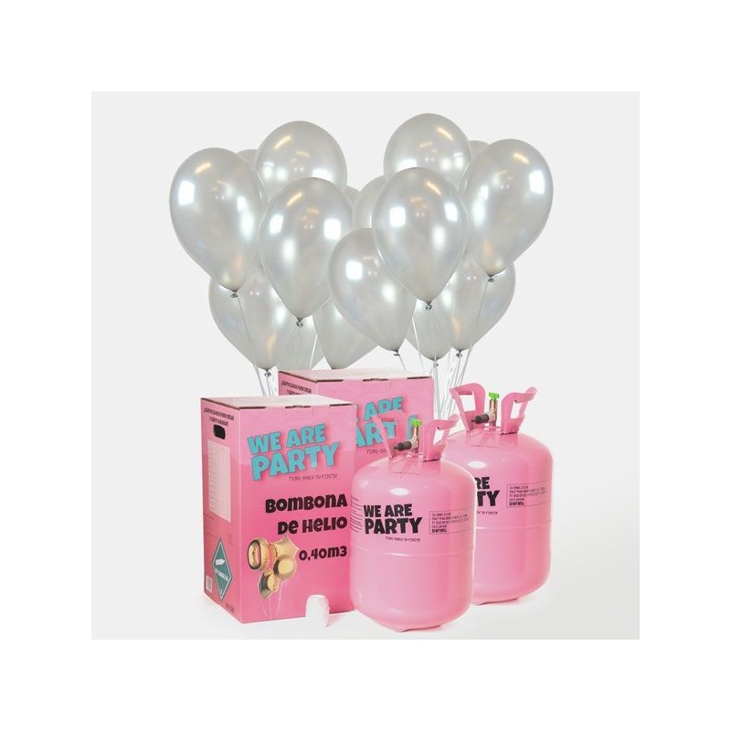Pack de bombona de helio con 100 globos plateados de 30 cm. Es un pack ideal para ocasiones especiales y elegantes, como fiestas de fin de año, comuniones, bodas y todo lo que quieras celebrar ya que el aspecto metalizado de los globos le da un aspecto genial. También es un pack perfecto para organizar tu propia suelta de globos!