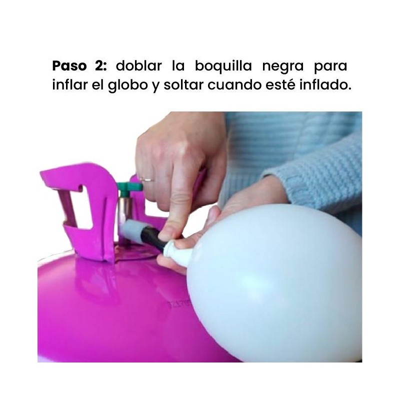 Solamente hay que abrir una llave verde que incluye en la parte superior girándola en sentido contrario a las agujas del reloj, y doblar la boquilla negra de goma. Al doblar la boquilla notaremos que comienza a salir el gas y verás como se inflan los globos.