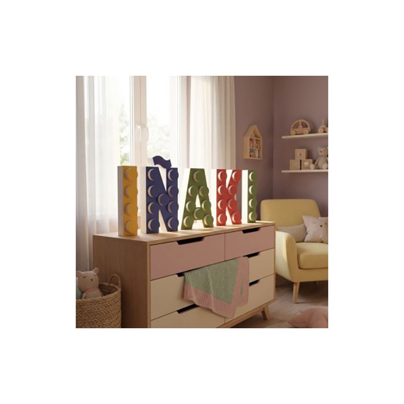 Pack de 3 Letras con forma de pieza de Lego con el nombre de tu hij@ con las que podrás decorar el cumpleaños o comunión de los más peques de la casa.