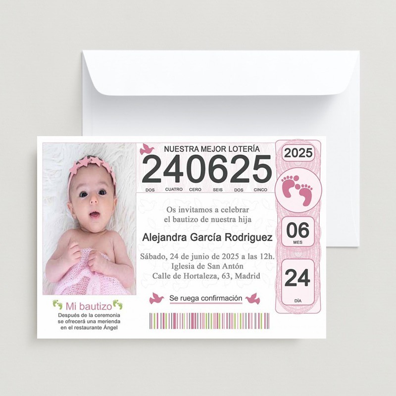 Pack de 20 invitaciones de Bautizo de niña personalizadas a tu gusto que consta de 20 tarjetas A5 y 20 sobres en color blanco.