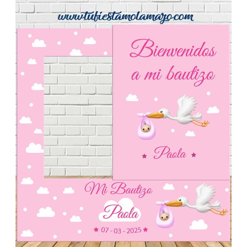 Marco de Photocall y cartel para Bautizo de Niña Personalizado en cartón, decorado con motivos de bautizo con una divertida cigüeña que lleva en el pico a un pequeño retoño.