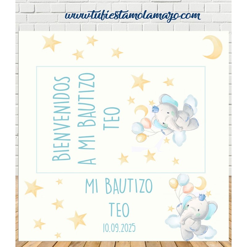 Photocall de Bautizo de elefante Personalizado en cartón, decorado con motivos de bautizo con un valiente y tierno elefante.