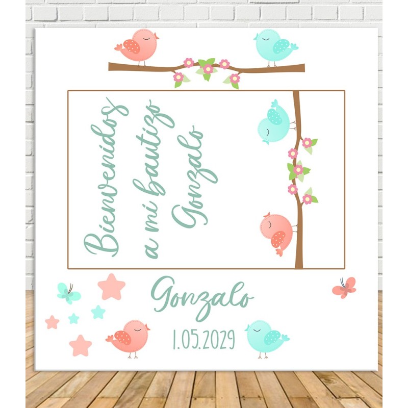 Photocall y cartel de Bautizo Pájaros Personalizado en cartón decorado con motivos de bautizo.