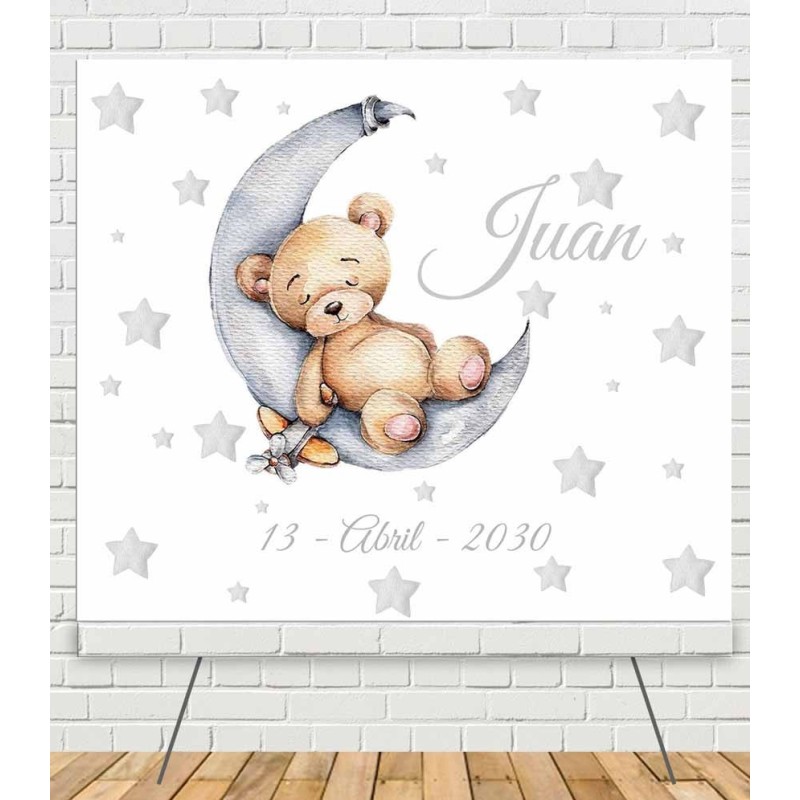 Photocall o cartel de bautizo de Oso decorado con estrellas grisis que podrás personalizar a tu gusto para decorar el día más especial de los más peques de la casa.