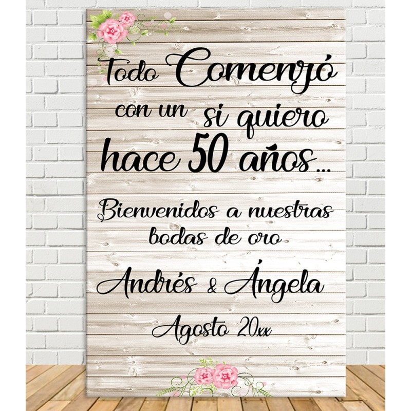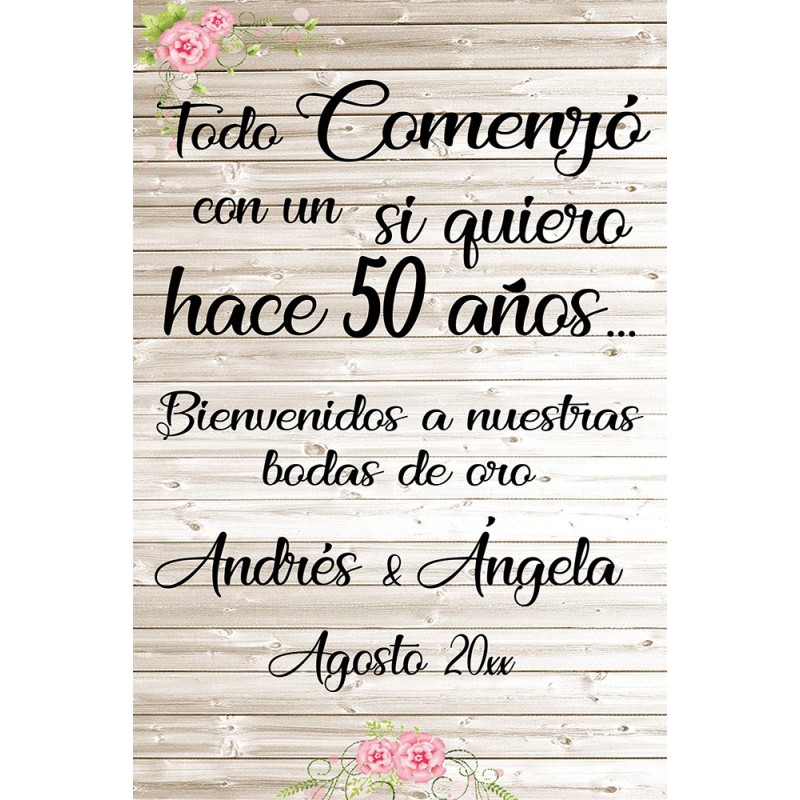 Cartel Bienvenida para celebrar las Bodas de ORO con fondo efecto madera para que el día de tu enlace sea perfecto para darle un toque diferente y elegante.