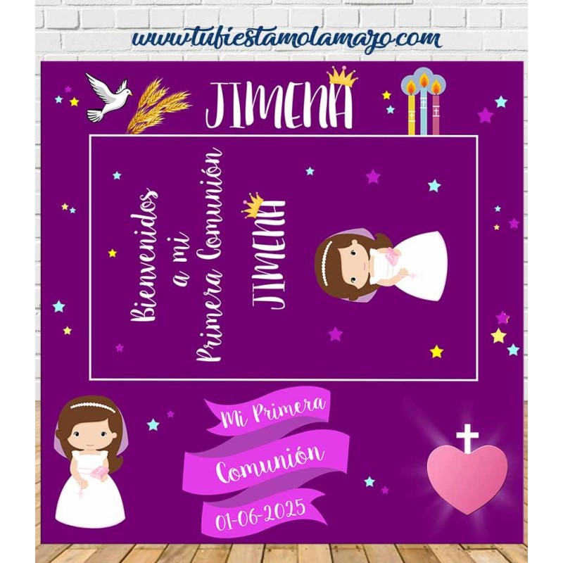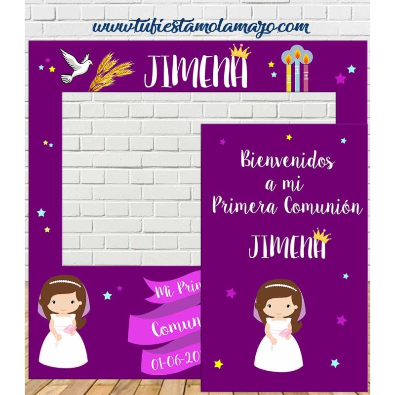 Photocall de comunión de Niña Personalizado en cartón, decorado con detalles de comunión en color lila.