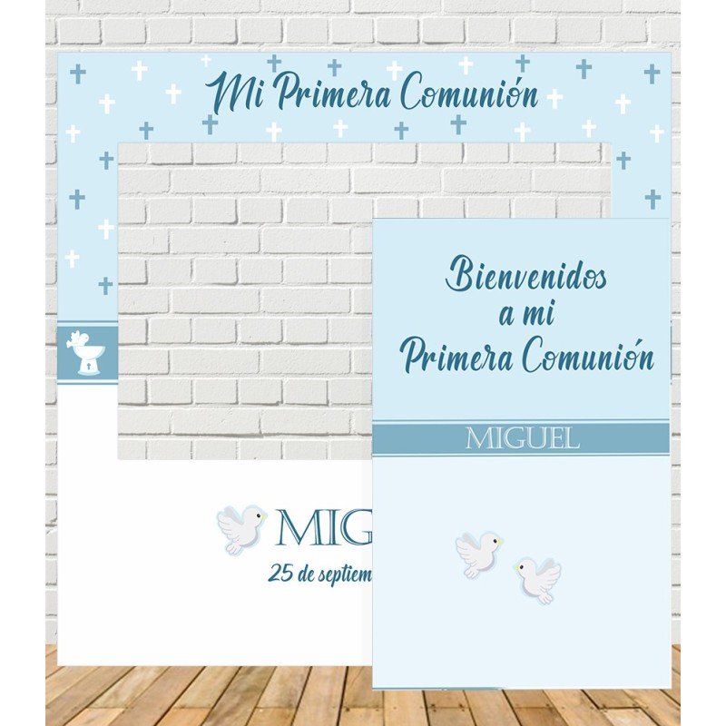 Photocall de comunión de cruces en color Azul Personalizado, decorado con motivos de comunión con cruces azul y blancas, para hacer que tus fotos de comunión sean más originales.