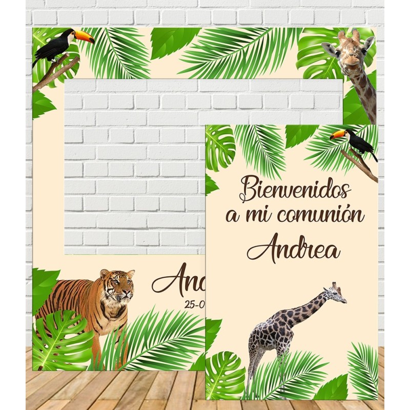 Photocall con forma de marco más cartel de bienvenida de comunión Niñ@ Personalizado, decorado con los motivos de moda para comunión de Selva para decorar uno de los días más importante de tu hij@.