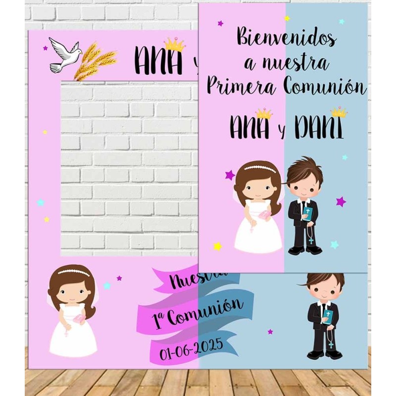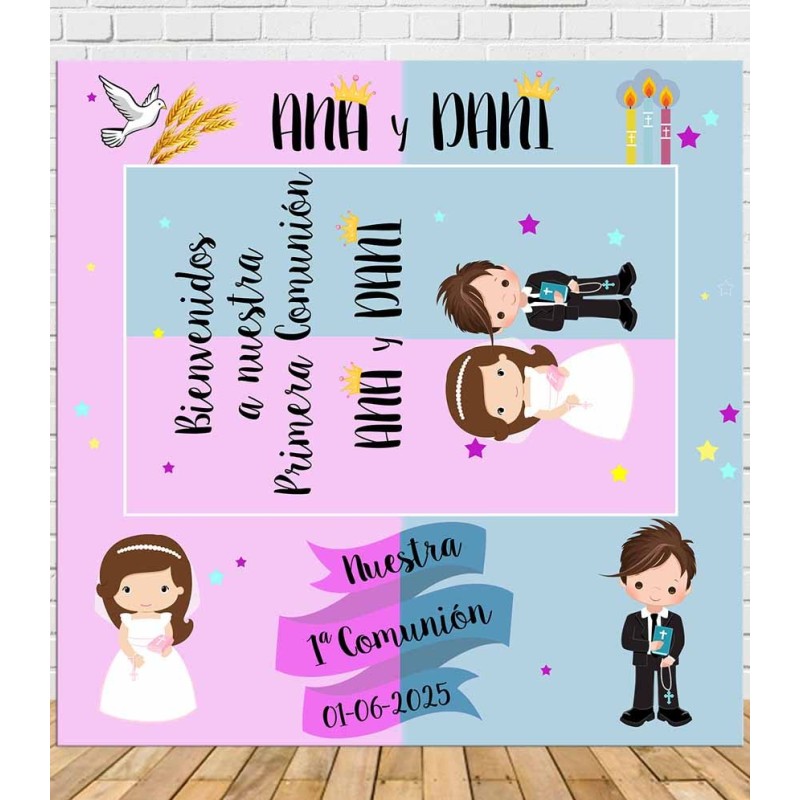 Photocall de comunión mixto Niñ@ Personalizado en cartón, decorado con motivos de comunión en color rosa y azul para que se sientan como los reyes de la fiesta.