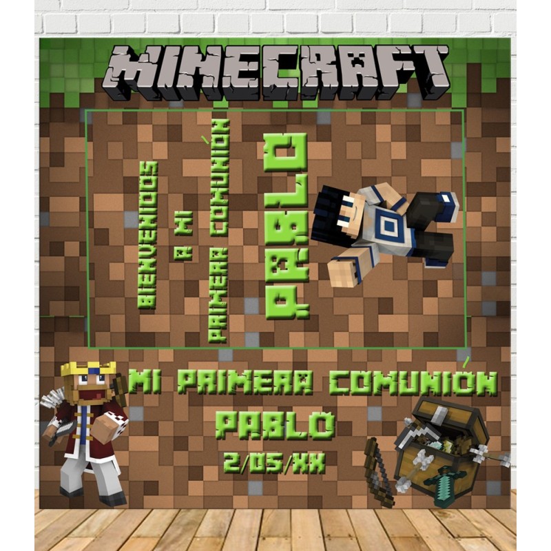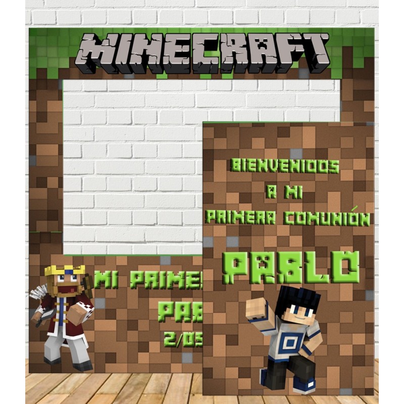 Photocall de Comunión Minecraft Personalizado y decorado con ilustraciones del juego de Minecraft, para que tu comunión tenga las fotos más originales
