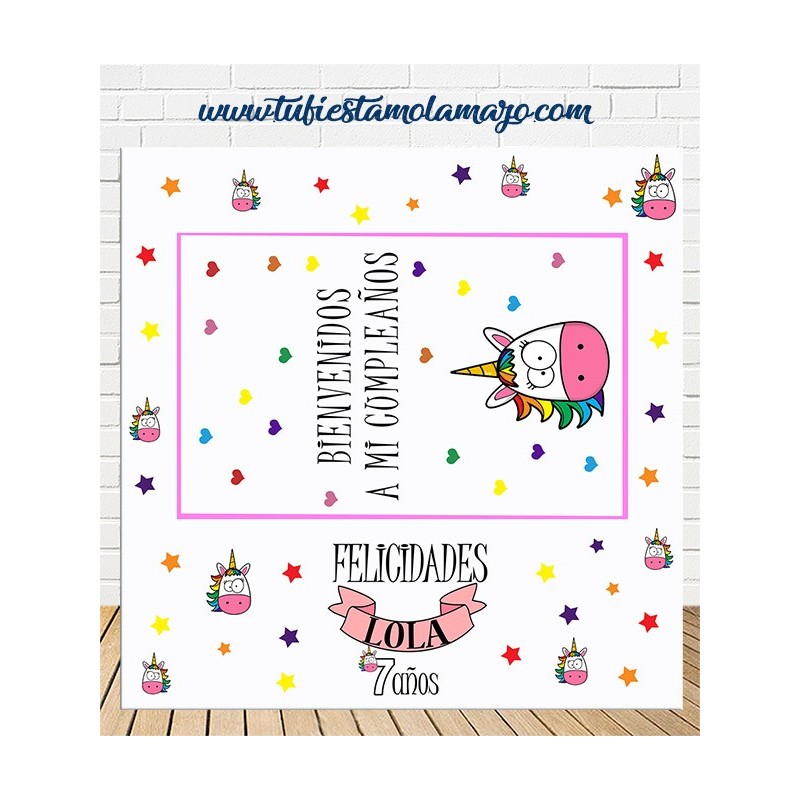 Photocall y cartel de cumpleaños de Niñ@ Personalizado en cartón, decorado con motivos de unicornios para hacer el día más especiales a los más peques de la casa.