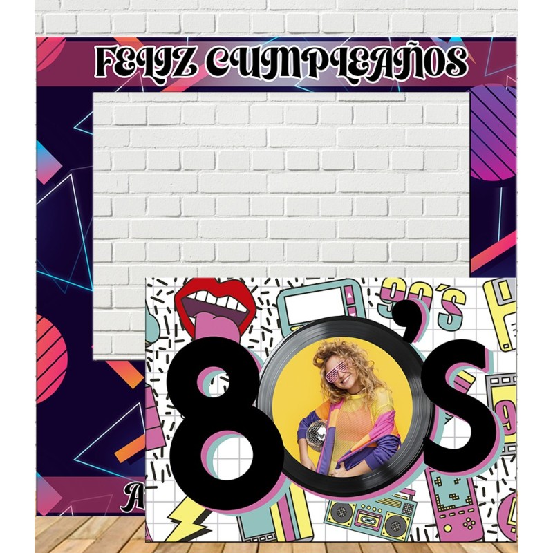 Photocall de Cumpleaños Personalizado 80s & 90s con estilo retro personalizado con la foto, el nombre y la edad.
